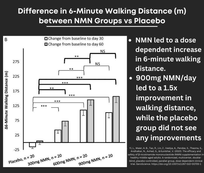 NMN is a naturally occurring nucleotide that plays a crucial role in energy metabolism. Supplementing with NMN has been shown to increase aerobic capacity, VO2 max, and ventilatory threshold in athletes, leading to improved endurance performance. Additionally, NMN supports anti-aging benefits by boosting NAD+ levels, enhancing insulin sensitivity, and promoting mitochondrial function.